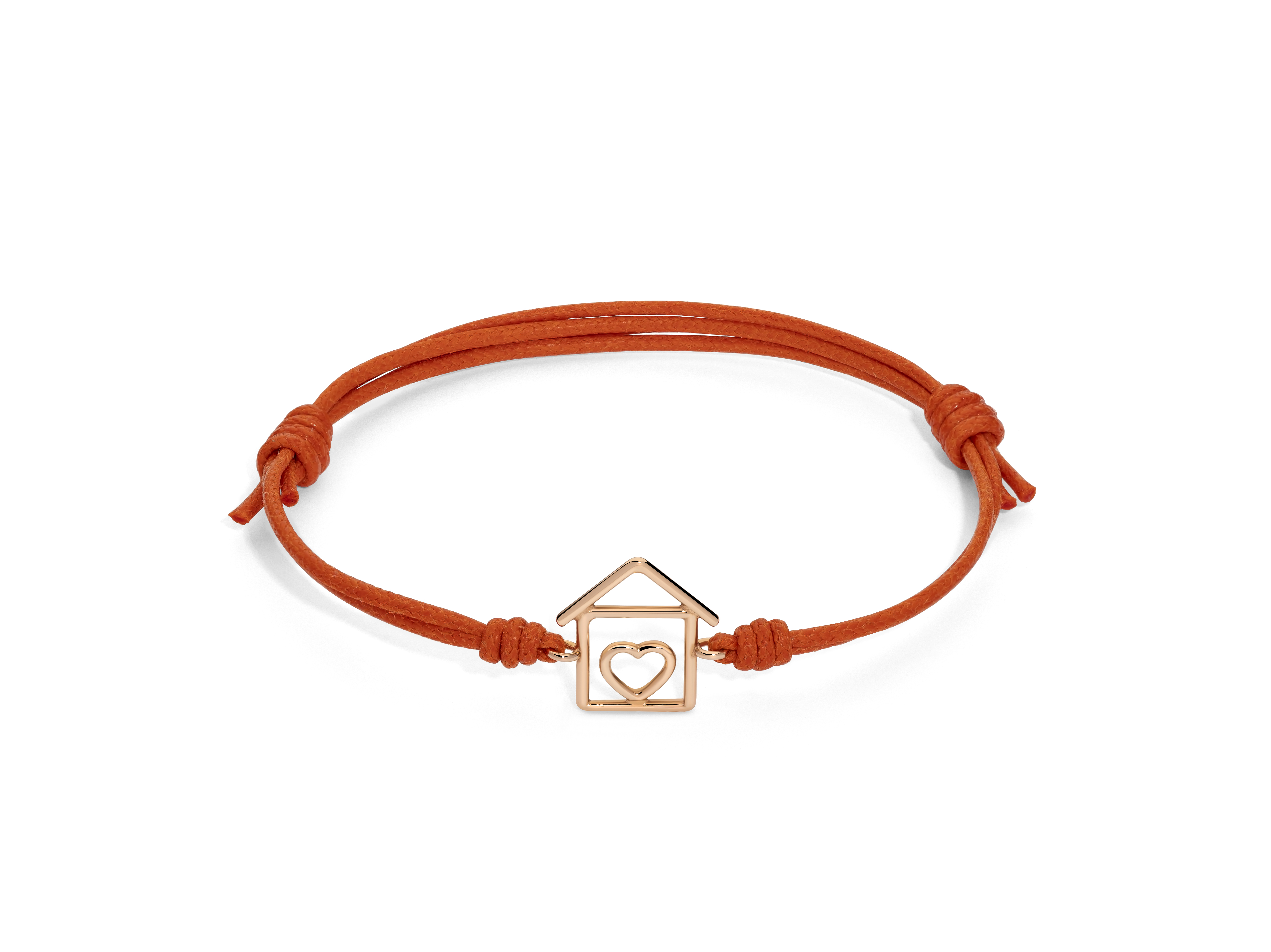 Bracciale cordino scorsoio con casetta e cuore in oro giallo 18kt o in oro rosa 18kt.